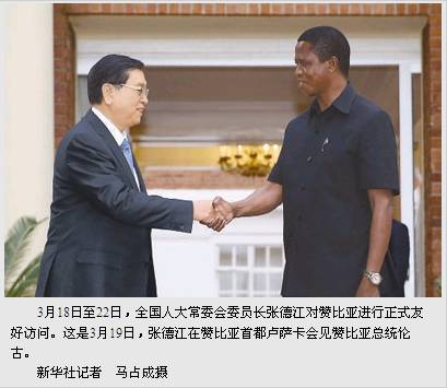 新华社卢萨卡3月22日电 (记者杨依军、彭立军)应赞比亚国民议会议长马蒂比尼邀请,全国人大常委会委员长张德江18日至22日对赞比亚进行正式友好访问,在首都卢萨卡会见赞比亚总统伦古,与马蒂比尼举行会谈,并会见赞比亚首任总统卡翁达。