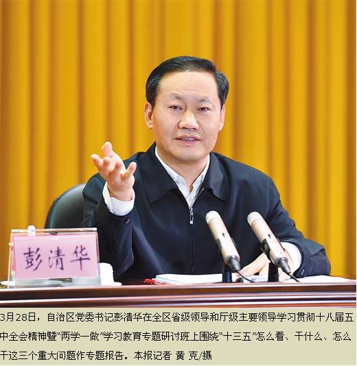 “十三五”干什么?彭清华表示,归结起来就是贯彻落实五大发展理念,深入实施四大战略,全面推进三大攻坚战,奋力实现“两个建成”目标。要抓好几件全局性、关键性、长远性的大事,加快培育战略性新兴产业,积极推动传统优势产业转型升级,建立有利于创新创业的体制机制,以创促升、以创促转,增强产业发展动能;强化双核驱动、三区统筹,着力打造支撑我区经济发展的强大引擎,充分发挥沿海沿江沿边优势,培育区域发展动能;深度融入“一带一路”建设,既要熟悉外部环境、国际规则,又要营造良好的内部环境,既要内部畅通又要对外联通,既要积极引进来又要主动走出去,充分利用国际国内两个市场、两种资源,提升开放发展动能;加快建设美丽广西,因地制宜发展特色产业、生态产业,走绿色发展之路,不以牺牲环境换取一时的经济发展,形成绿色发展动能;着力补齐产业结构、脱贫攻坚、基础设施、科教人才、公共服务等短板,挖掘潜在发展动能。