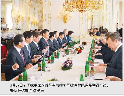 习近平指出,捷克是最早承认并同新中国建交的国家之一,两国和两国人民友谊源远流长。当前,中捷关系已经进入春华夏实的时候,发展势头积极向好,双方高层交往密切,经贸等各领域合作蓬勃发展。中方愿同捷方一道,珍惜中捷关系来之不易的良好局面,巩固中捷传统友谊,增进双方政治互信,推动两国务实合作取得更多新成果,使中捷友好事业薪火相传。