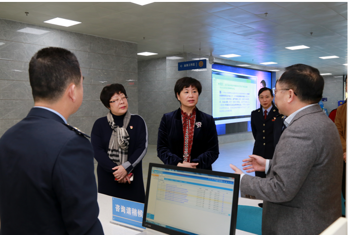 在城中区税务局,黄丽娟部长调研了党建引领智能化办税服务厅、廉政文化室和党建活动室,对办税服务厅软硬件设施、党员先锋模范作用等有关情况进行详细了解,对税务局始终注重党建引领税收工作,将党支部建在办税服务一线,设立党员示范岗、巾帼文明岗,发挥党员先锋队、青年突出队的作用,有效减税降费和优化营商环境等成效表示肯定。黄丽娟部长指出,城中区税务局要深入学习贯彻党的十九大精神,把思想和行动统一到党中央的决策部署上来,确保改革的稳步推进;同时充分发挥党建在优化营商环境、减税降费方面的引领作用,充分发挥税收职能作用,构建优化高效统一的税收征管体系。