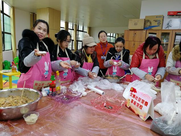 下午组织辖区党员群众开展家庭党校活动。活动第一阶段,文博社区党委书记林秋玲总结2018年文博社区家庭党校开展情况,并解决辖区居民关心的热点难点问题,听取党员对2019年家庭党校工作的建议和意见。第二阶段开展包汤圆迎元宵活动。社区党委成员与居民大家欢聚一堂,用自制汤圆的方式来庆祝这个传统的节日,甜甜蜜蜜的汤圆代表幸福团圆,感受元宵佳节的喜庆氛围。