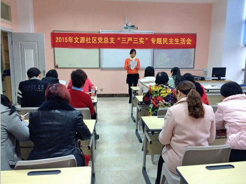 2015年12月25日上午,文源社区党总支召开了“三严三实”专题民主生活会,社区党总支书记孙敏主持会议,围绕“三严三实”精神实质开展了批评与自我批评。