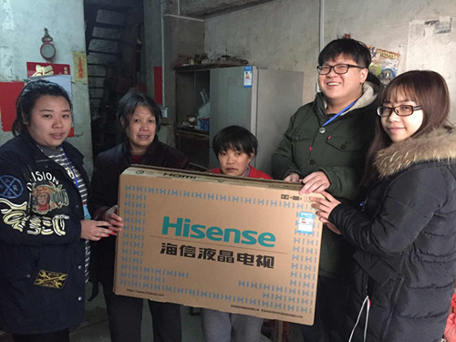 2月5日,城中区中南街道办事处工作人员抬着一台32寸液晶平板电视,来到了居民何燕玲的家中,帮助她实现微心愿。
