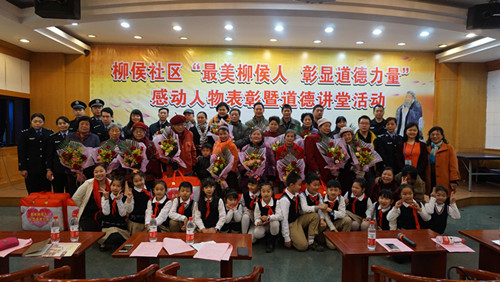 道德讲堂共有“自我反省”、“唱歌曲”、“诵经典”、“学模范”、“谈感悟”、“送吉祥”等六个部分。少先队员响亮动听的声音演唱了道德歌曲《劳动最光荣》;紧接着孩子们又给大家带来耳熟能详的经典诵读《三字经》;聆听道德模范的道德故事,“学模范”更是把整个活动推向了高潮。“最美柳侯人”评选表彰让现场掌声不断,“最美柳侯人”韦阿姨接过奖品和鲜花后含着泪水激动地说:“我能当选最美柳侯人感到很幸福,谢谢社区给我这个殊荣,照顾家里老人是每个儿女应该做的,希望社区的孩子都能孝老爱亲”。