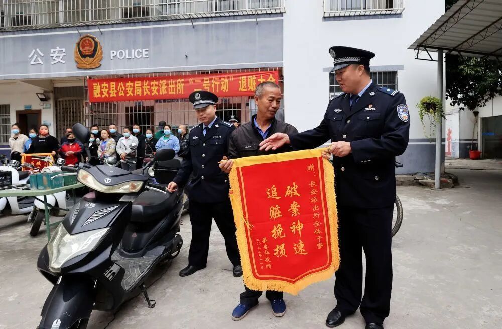 在融安县公安局长安派出所“二号行动”退赃现场,一名失主向公安民警赠送锦旗。(谭凯兴 摄) |