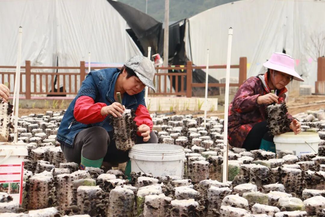 在泗顶镇儒南村拉井屯木耳种植基地,村民们正在采摘木耳