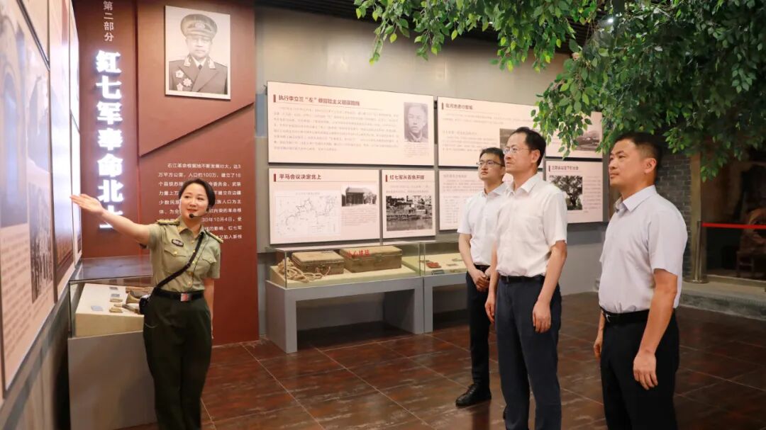 5月30日,在“红七军战长安”纪念馆,柳州市委常委、组织部部长文东福(左二)正在听取讲解,县委书记陈文敏(右一)陪同调研。(蒋阳阳 摄) 调研中,文东福提出了具有针对性和建设性的意见和建议,要求要用好用活红色文化资源,充分发挥红色教育基地展示、纪念、宣传、教育等综合作用,传播红色文化,传承弘扬革命精神。