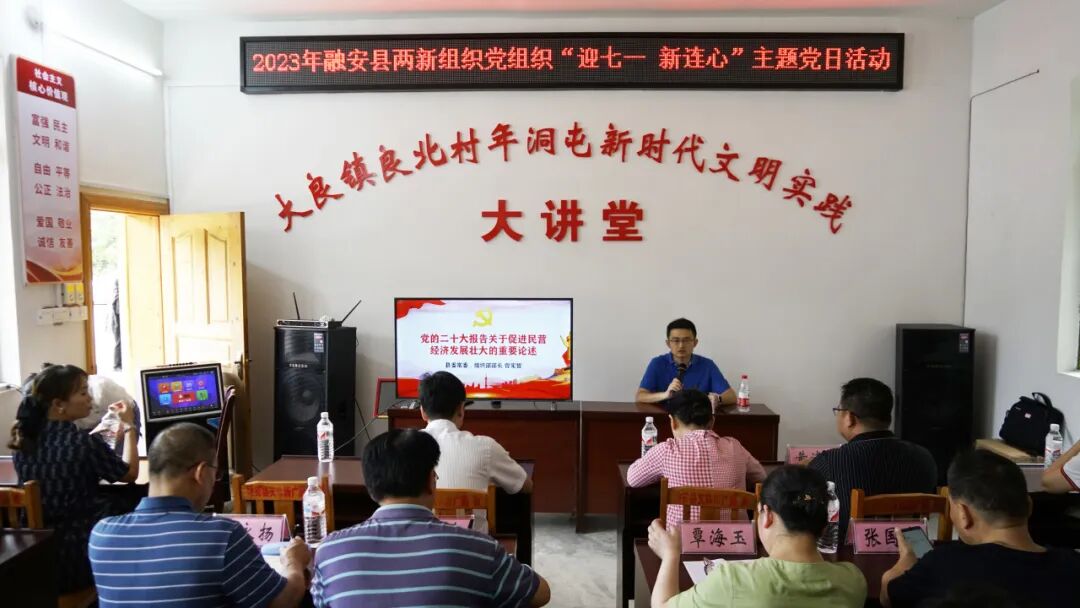 为喜迎“七一”建党节的到来,深入学习贯彻党的二十大精神,唱响爱党爱国主旋律,进一步激发两新组织党员的干事创业热情与活力,增强党组织凝聚力和战斗力。6月29日,融安县两新组织党工委在大良镇良北村年洞屯开展“迎七一 新连心”主题党日活动,县两新组织挂任第一书记、党建指导员、党组织书记、党员和预备党员100余人参加。