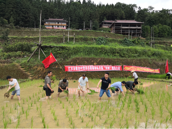 5月31日,红水乡黄奈坡上传来了阵阵欢声笑语,一面面鲜红的党旗飘扬在田间地头,40多名党员干部挥洒着汗水,义务为群众耕田、除草、插秧、放养禾花鲤及田螺。