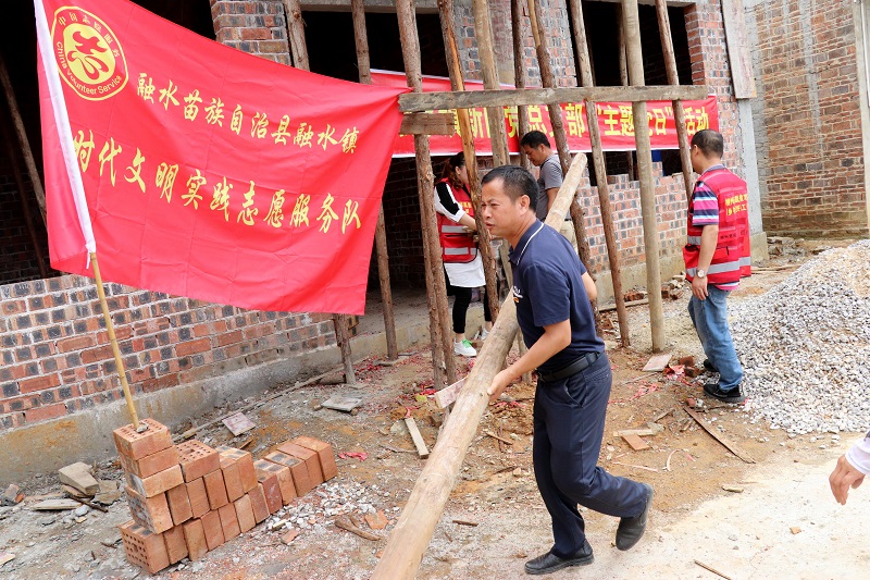 志愿服务济穷困,文明实践扬新风。5月22日,融水镇新时代文明实践志愿服务队组织党员、志愿者开展“农村扶贫济困”志愿服务活动,为新国村于七屯贫困户欧卫忠即将建成的新房拆模、清运建筑废料,帮助他早日入住新房。