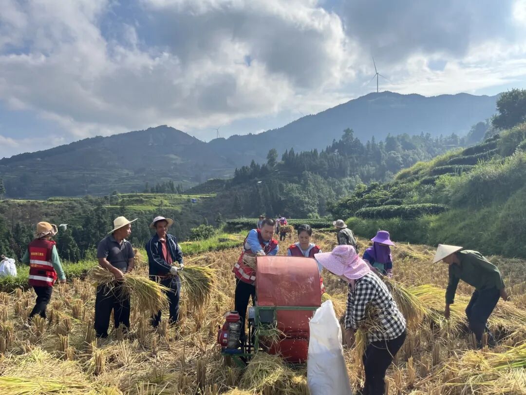 林静与村“两委”、工作队员帮助老人户收割稻谷。