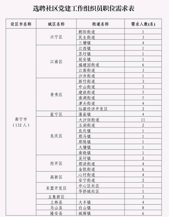 (一)选聘数量。共796名,其中,南宁市132名、柳州市118名、桂林市52名、梧州市66名、北海市26名、防城港市7名、钦州市53名、贵港市77名、玉林市67名、百色市48名、贺州市36名、河池市47名、来宾市48名、崇左市19名。