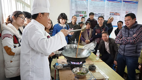培训邀请到了原柳州饭店绿岛餐厅厨师长、原柳州市劳动培训中心烹调培训老师曲云平。曲老师根据当地特产,教给前来听课的村民如何制作白切鸡、柠檬鸭、柚子皮扣等几道美味的家常菜。约有50位村民参加了培训班,他们非常专注地听曲老师的讲解,有不明白的地方积极提问,课堂氛围相当活跃。课后很多村民都表示一下午的时间太短,他们想学的还有很多,希望劳保中心能多将这样的培训班开到他们身边。
