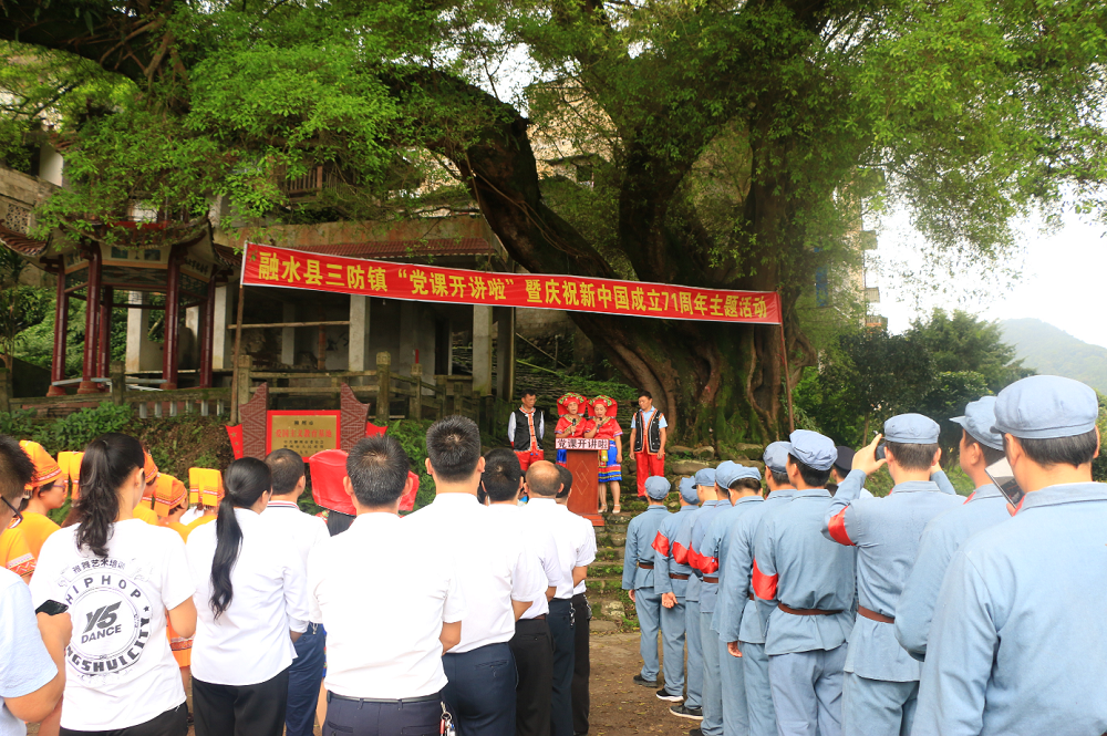 9月29日,在金秋收获的季节,融水县三防群众齐聚贝江河畔、红军古榕下,用壮族山歌、百姓宣讲上了一堂生动形象的党课,讲述三防扶贫征途的新变化,共同祝愿祖国更富强。