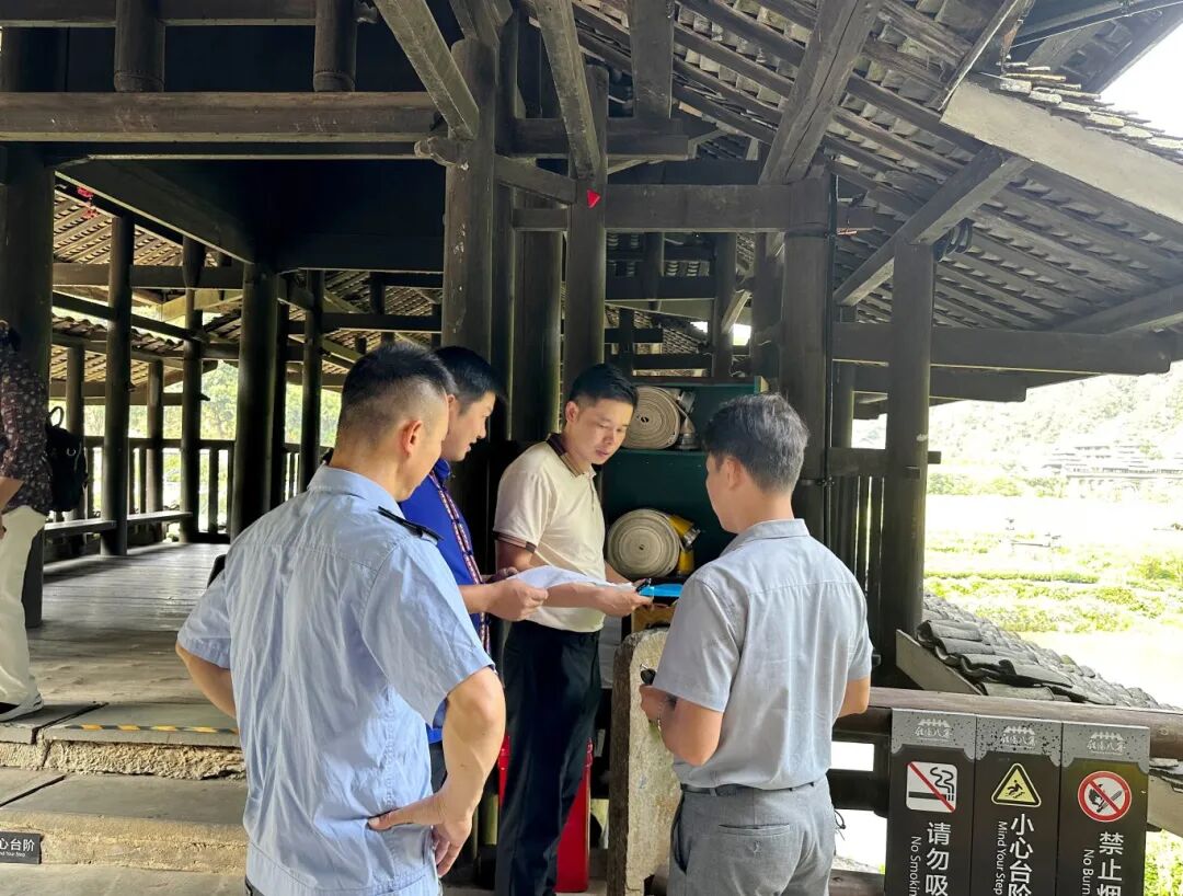 清晨8点,太阳初升,程阳八寨景区巷道中已出现一个忙碌的身影——他身穿景区工作服,拿着巡检记录表行走在巷道里,脚步沉稳、目光如炬,他就是景区管理中心党支部党员唐日斌。弯腰拨开灌木丛查看防滑垫是否松动,抬手触摸消防栓确认水压正常,这套熟练的动作源自他十多年的军旅生涯,也成了景区安全防线的“日常密码”。