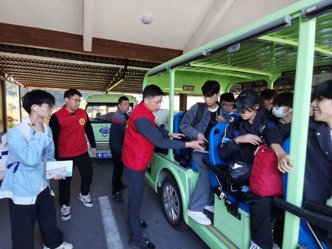 唐日斌引导游客乘坐观光车。