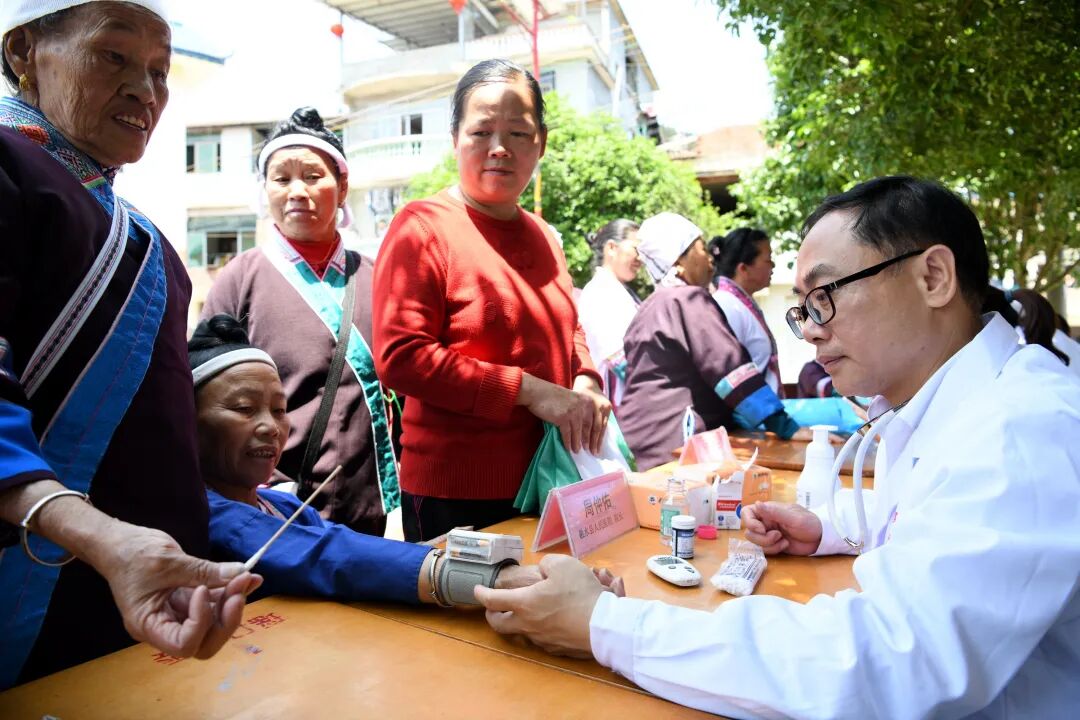 在白云乡瑶口村竹口屯,中组部“组团式”帮扶医学硕士周仲佑给当地群众测量血压
